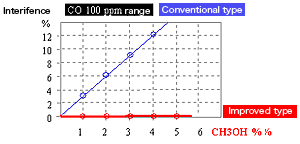 Influence of interference by high concentration CH3OH (0 to 5%) coexistent in sample gas is minimized.
