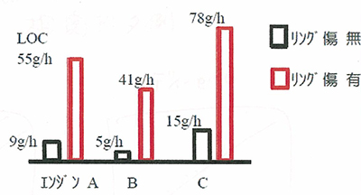 右図は試験エンジンA〜Cの各リングに傷をつける前後のオイル消費量の変化をとらえた一例です。